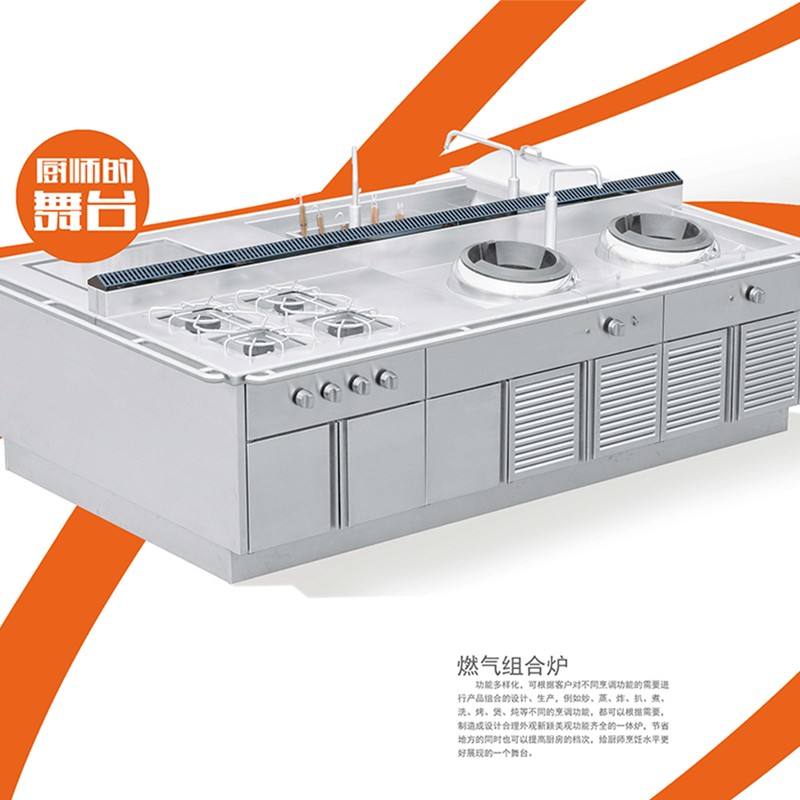 功能多样化,可根据客户对不同烹调功能的需要进行产品组合的设计、生产,例如炒、蒸、炸、扒、煮、洗、烤、煲、炖等不同的烹调功能,都可以根据需要,制造成设计合理外观新颖美观功能齐全的一体炉,节省地方的同时也可以提高厨房的档次,给厨师烹饪水平更好展现的一个舞台